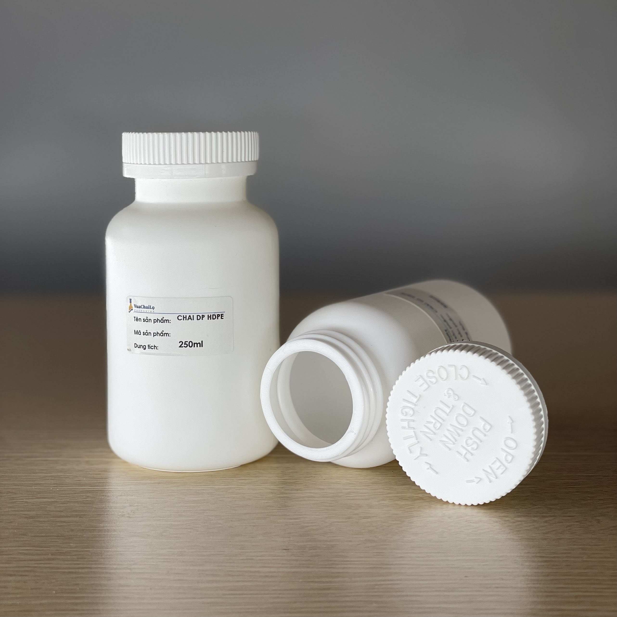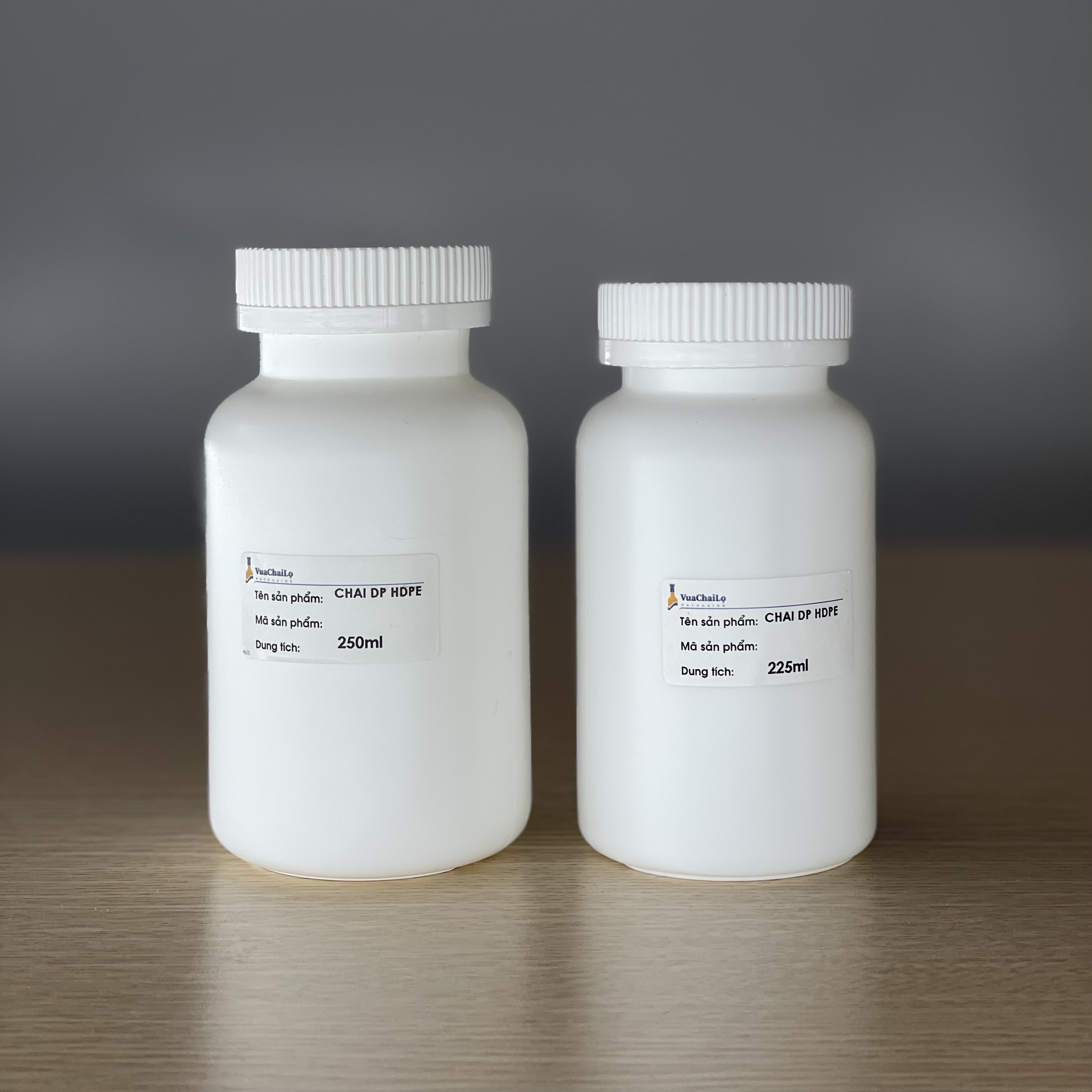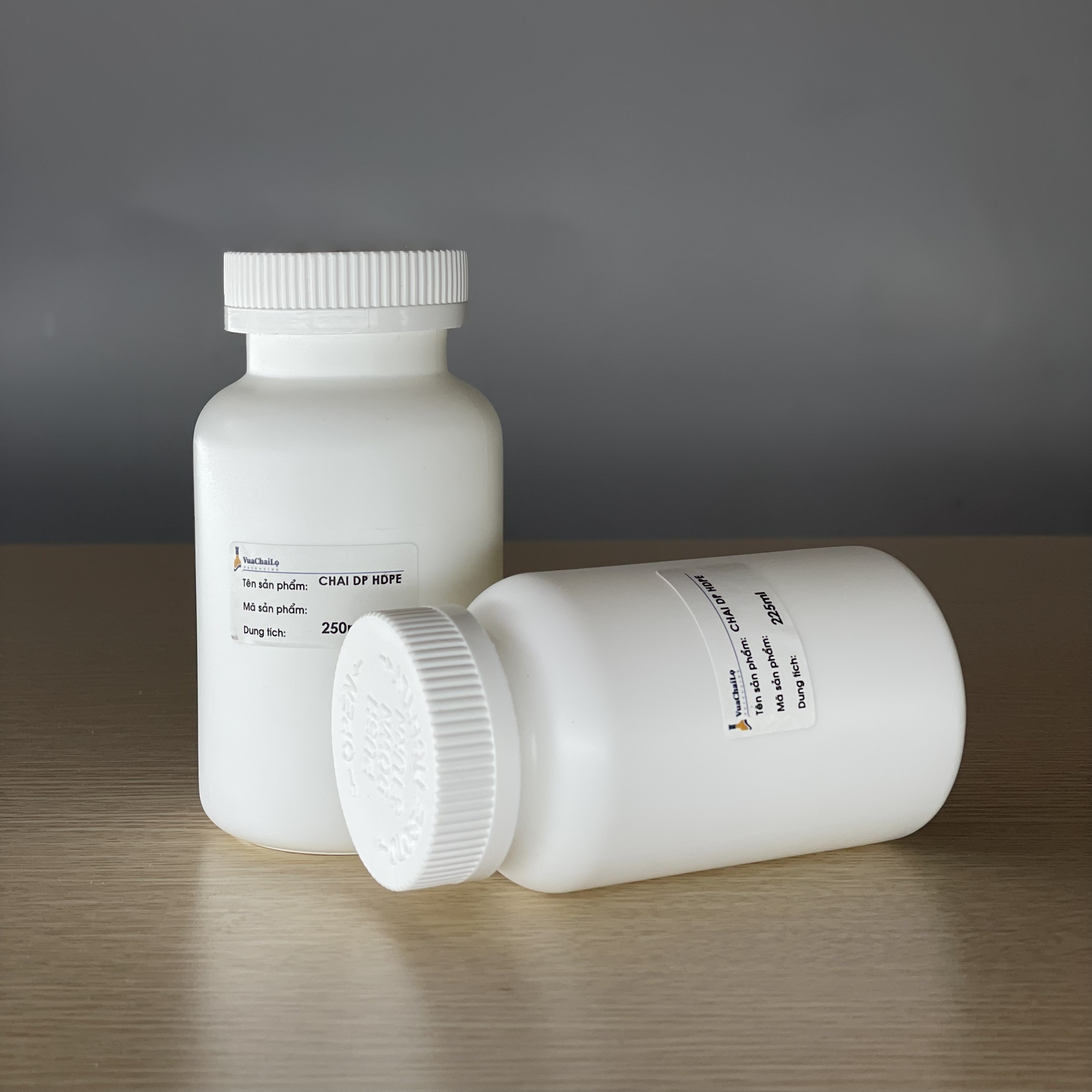Chai Dược Phẩm Nhựa HDPE 225ml và 250ml cùng với nắp loại nắp thông dụng được sử dụng nhiều để đựng các loại dược phẩm viên nén và dạng viên, hoặc có thể dùng làm vỏ lọ đựng thực phẩm chức năng.