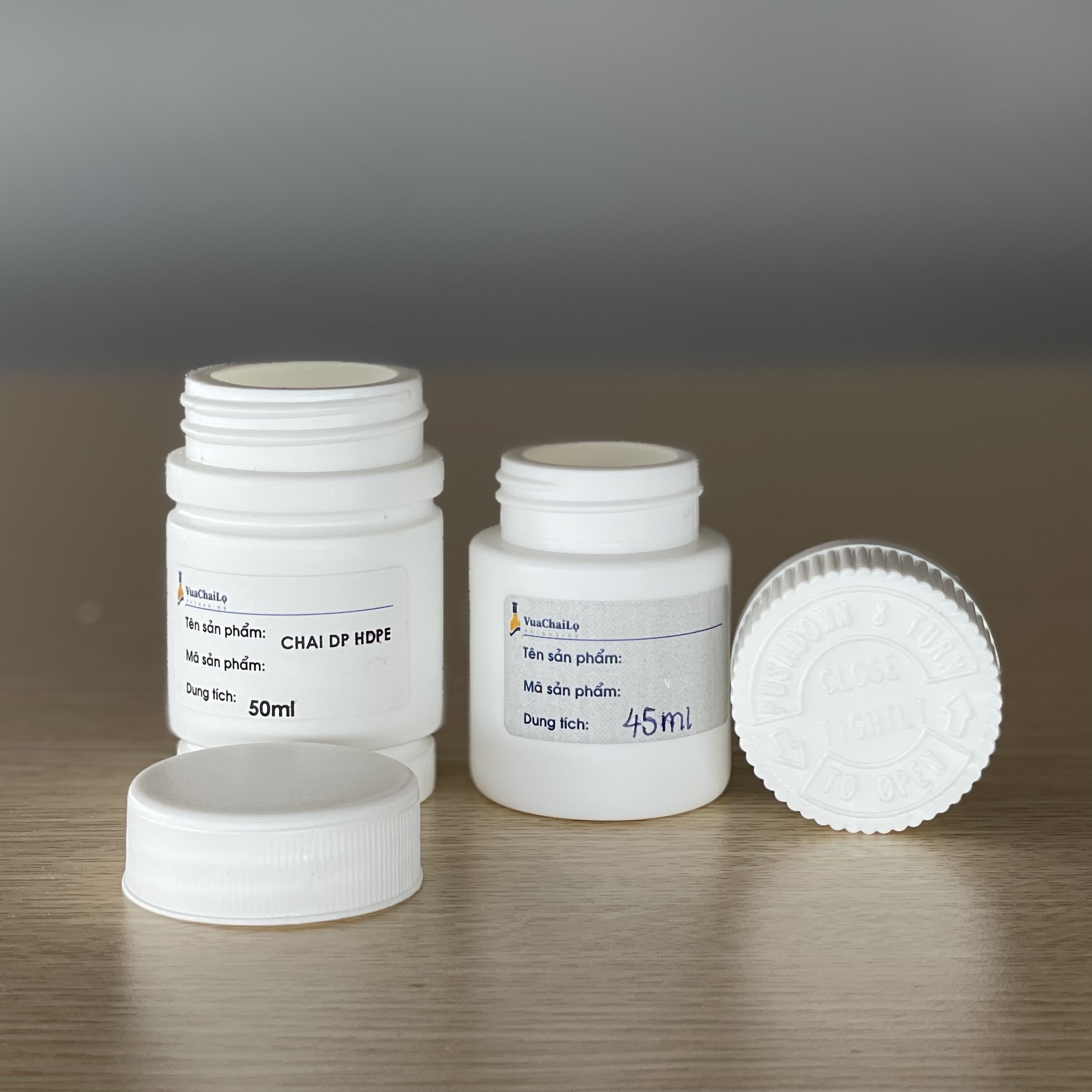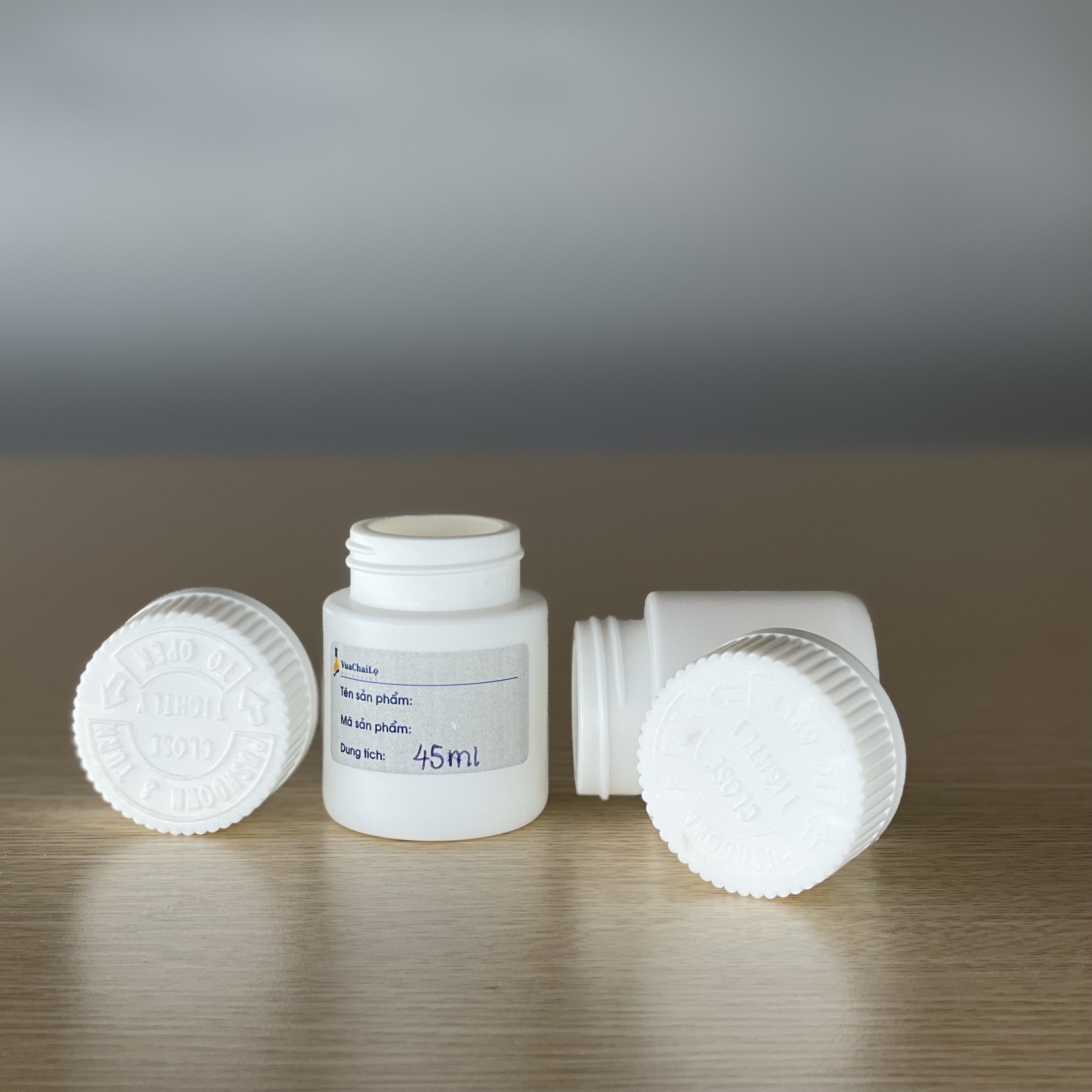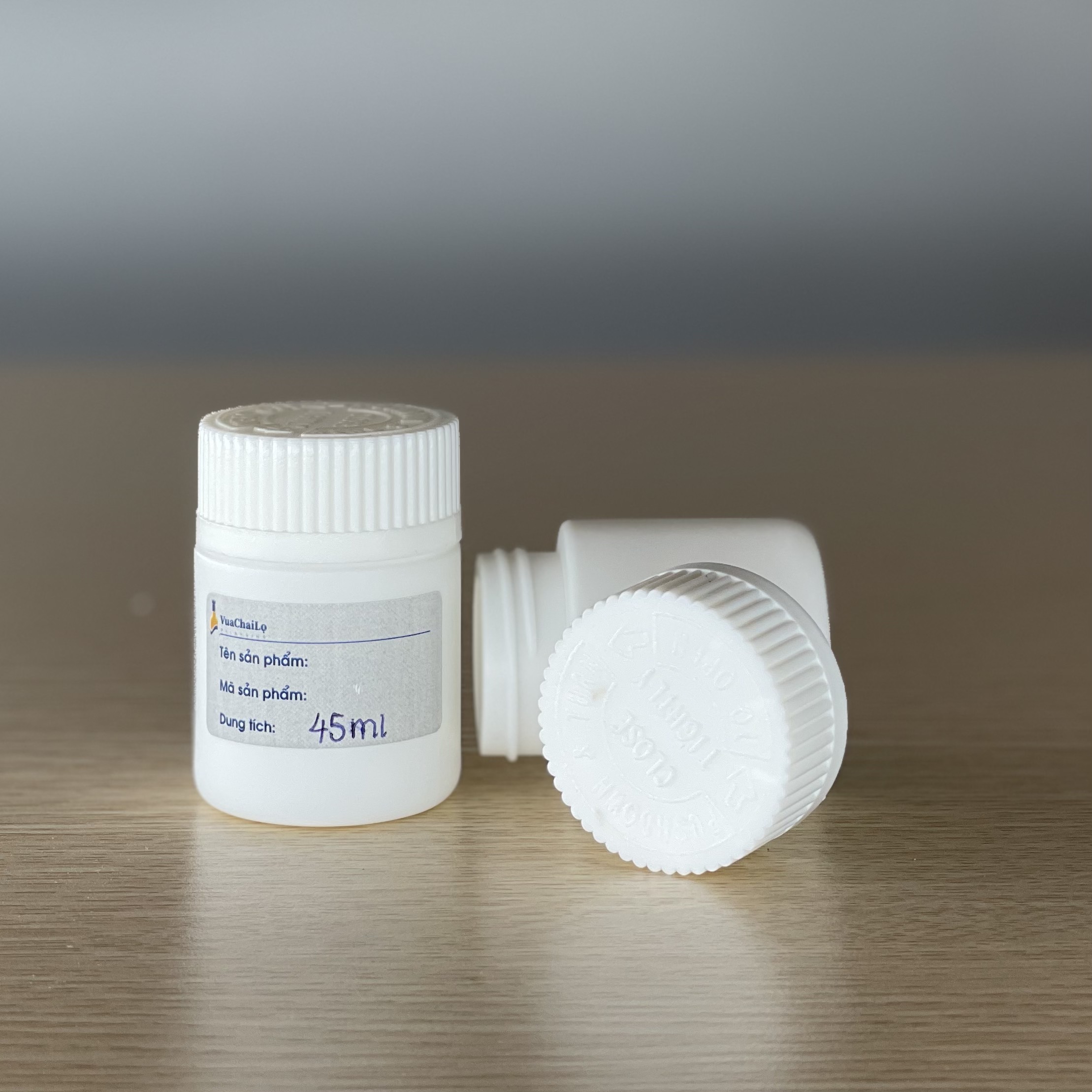 Chai Dược Phẩm Nhựa HDPE 45ml cùng với nắp loại nắp thông dụng được sử dụng nhiều để đựng các loại dược phẩm viên nén và dạng viên, hoặc có thể dùng làm vỏ lọ đựng thực phẩm chức năng.