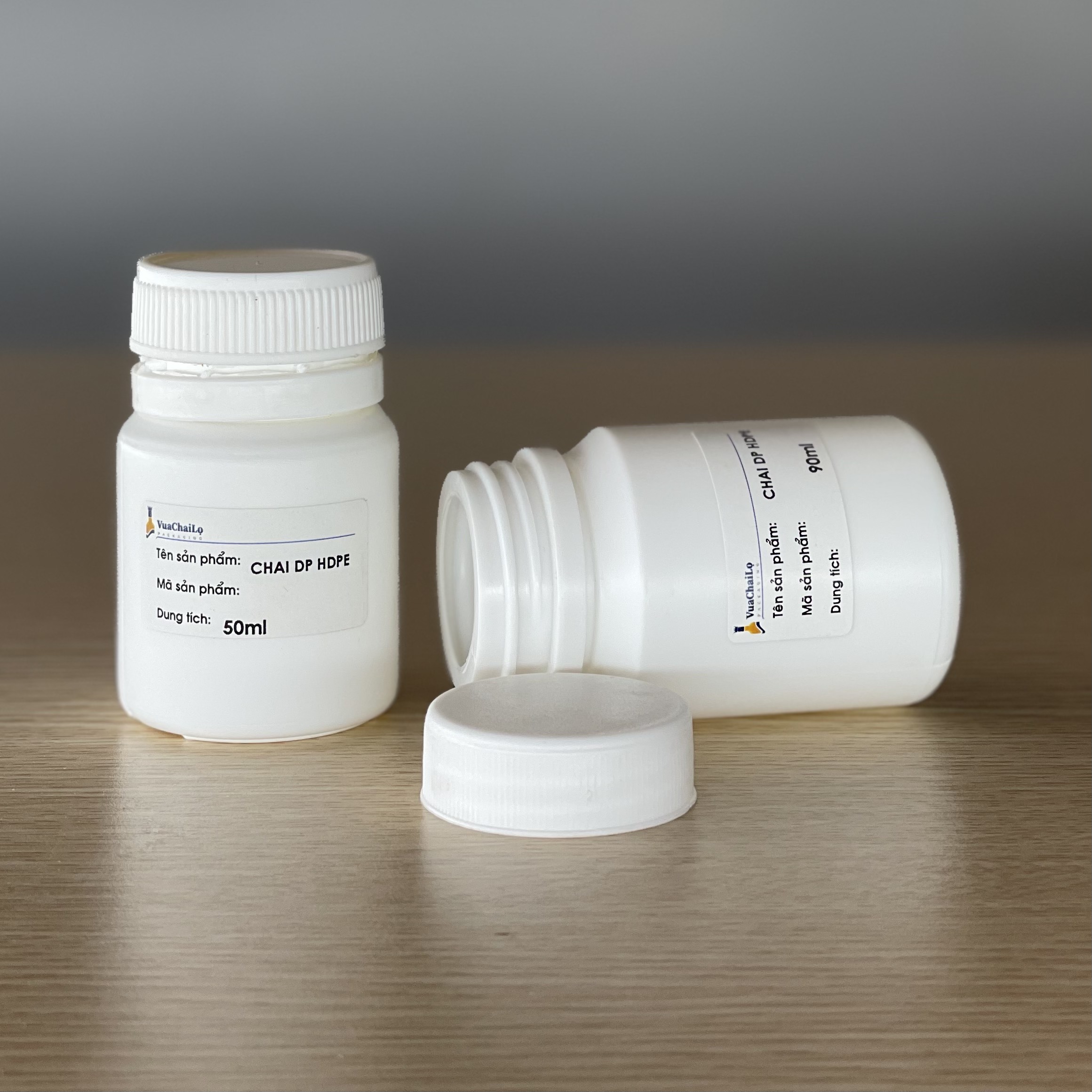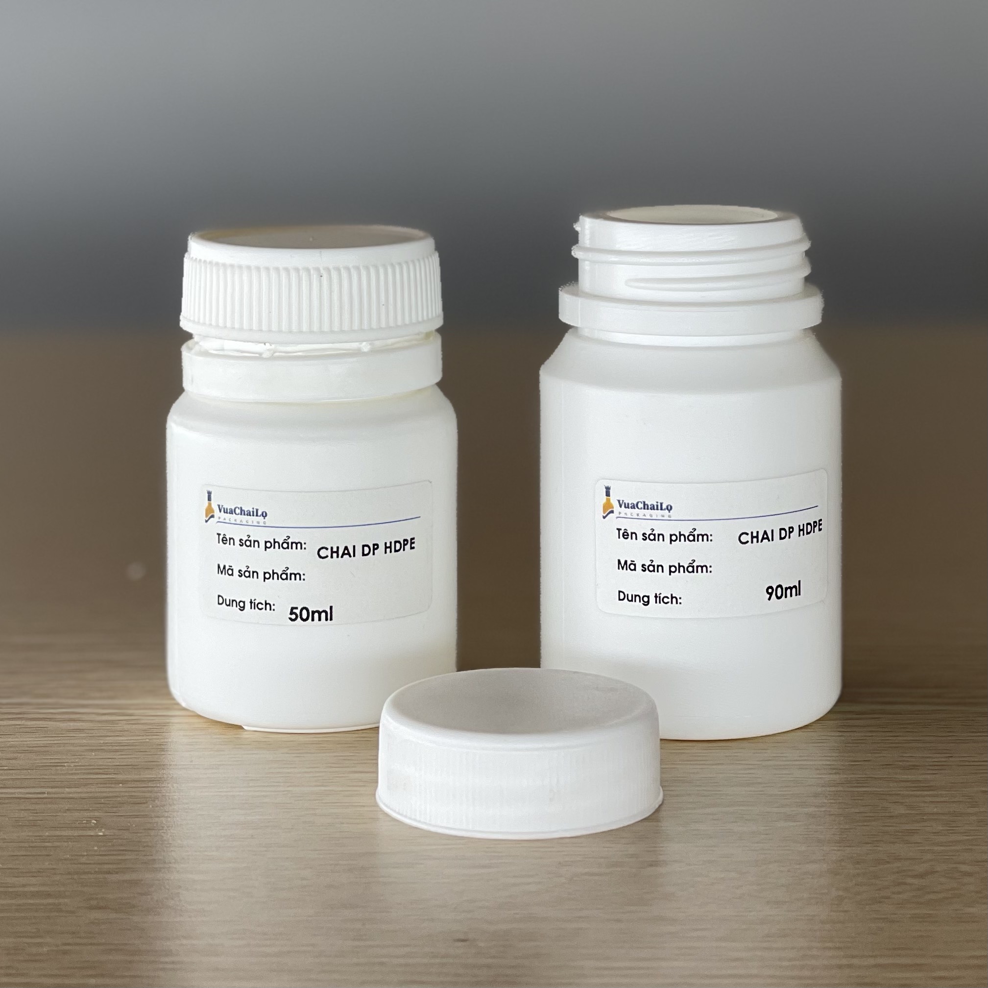 Chai Dược Phẩm Nhựa HDPE 50ml và 90ml cùng với nắp loại nắp thông dụng được sử dụng nhiều để đựng các loại dược phẩm viên nén và dạng viên, hoặc có thể dùng làm vỏ lọ đựng thực phẩm chức năng.