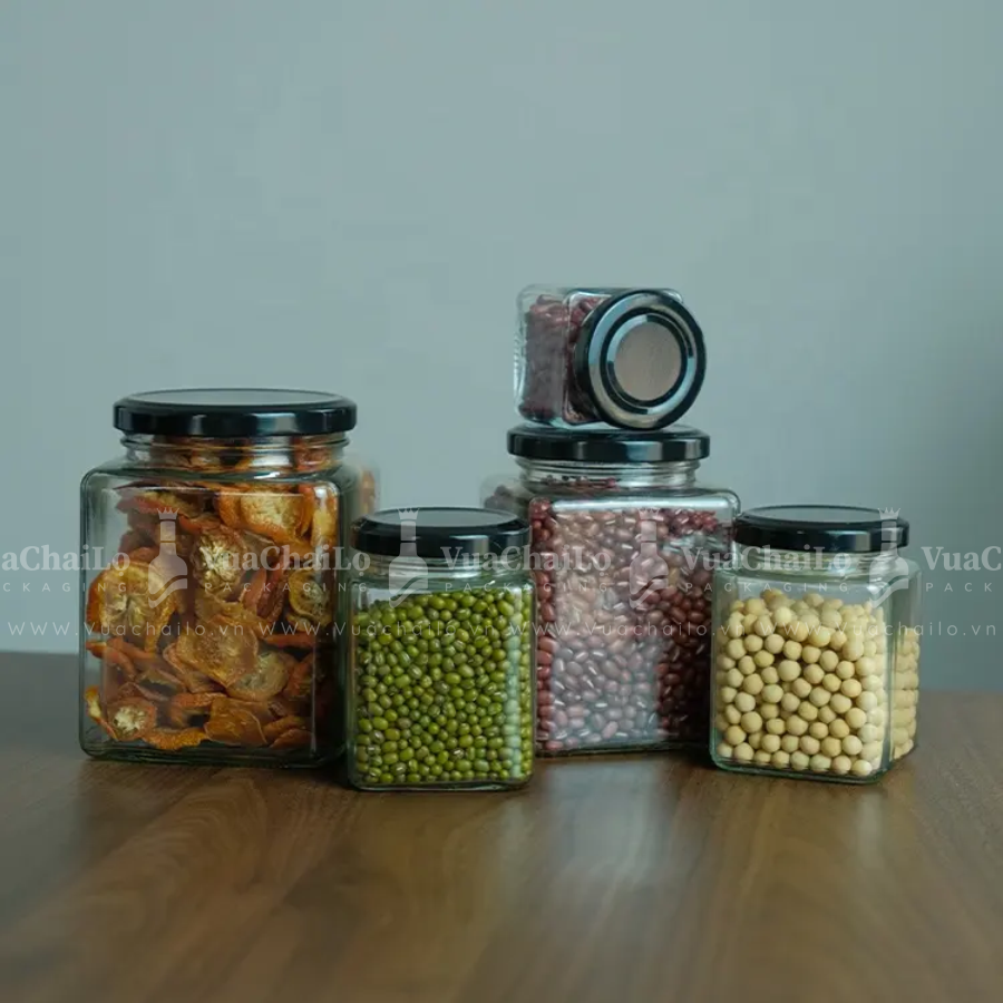 - Hũ vuông thủy tinh: Tiết kiệm diện tích, tạo vẻ sang trọng, hiện đại.
