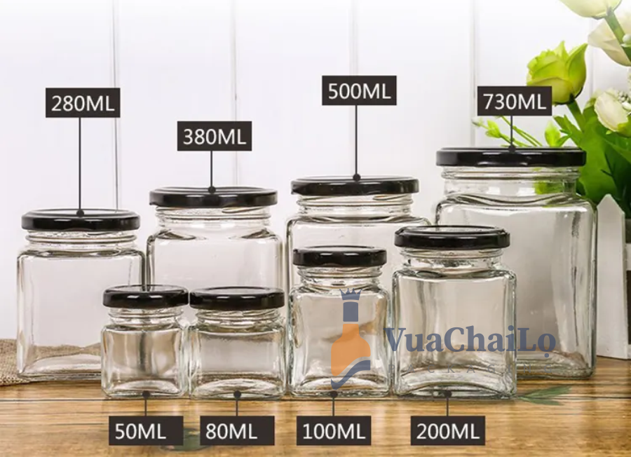 - Dung tích đa dạng: từ hũ mini 30ml, 50ml, 100ml cho gia vị, mật ong… đến hũ dung tích lớn 500ml, 1000ml đựng mứt, bánh kẹo, trà.