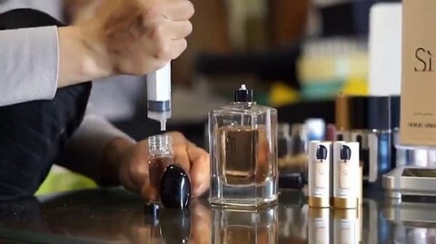 - Sau đó, lấy 1 chai nhỏ đựng nước hoa chiết và cho vòi xịt vào miệng chai chiết và nhấn đến khi lọ chứa đầy nước hoa